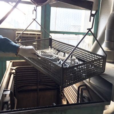 パーツの金属表面に付着した防錆油や加工油、ほこり、金属片などを取り除いていきます。